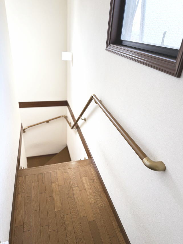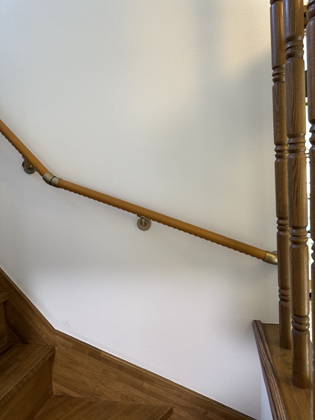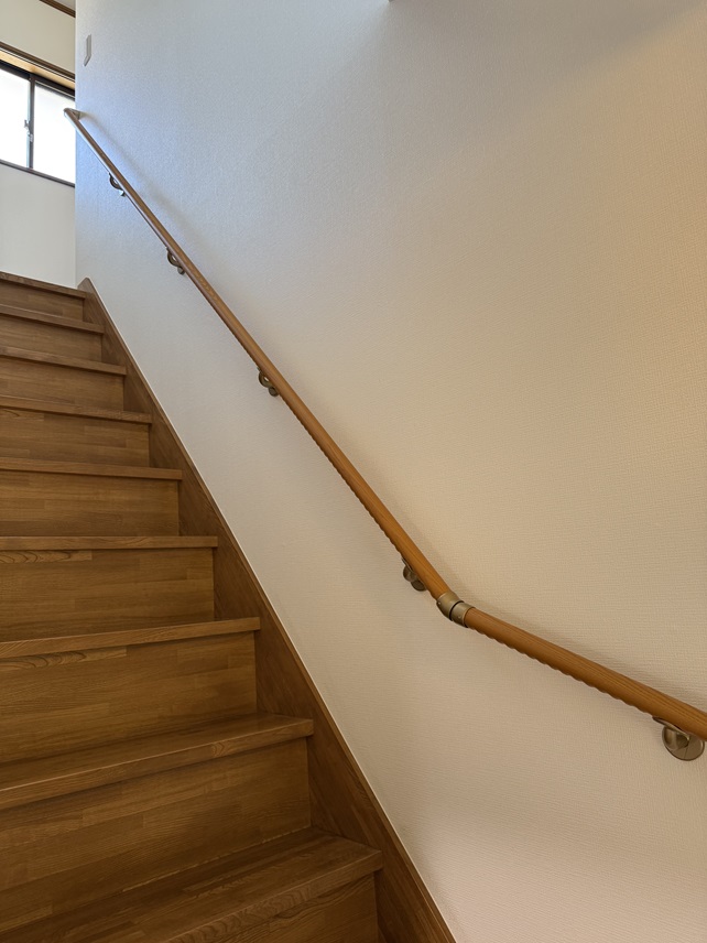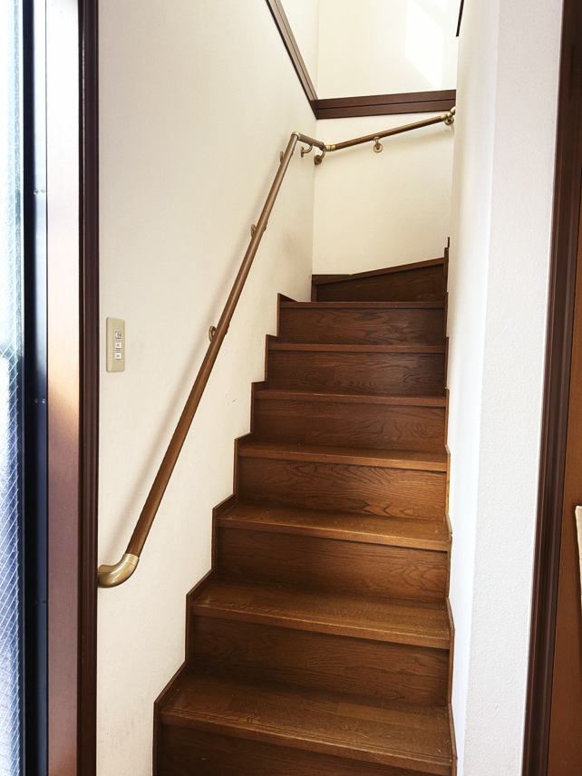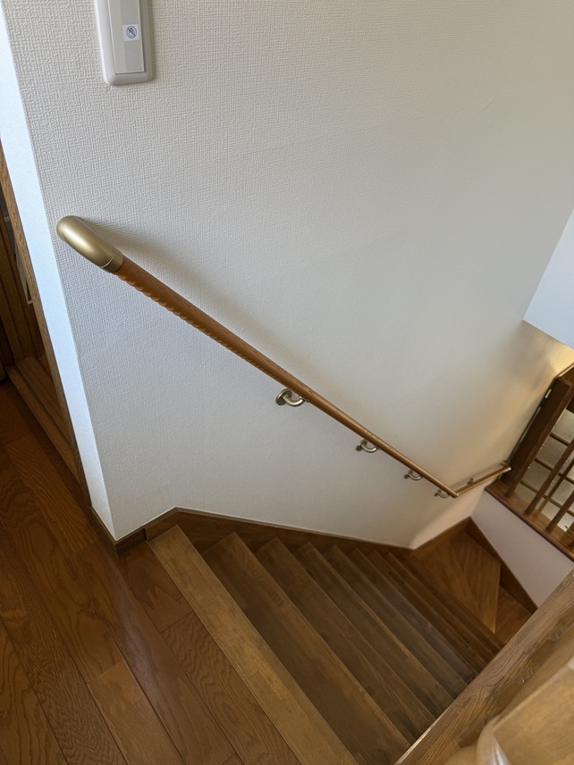 目黒区の階段手すり工事。90度曲がり一か所の階段に手すりを取り付けました。 高さは段鼻(踏面先端)から垂直に75センチ程度の標準高さで下から上まで連続しています。 間柱が標準的な位置(約45センチ間隔)にあったので間柱の位置を狙ってブラケットを固定。 上り切った2階廊下も水平に設置して安全性を高める工夫をしています。 |